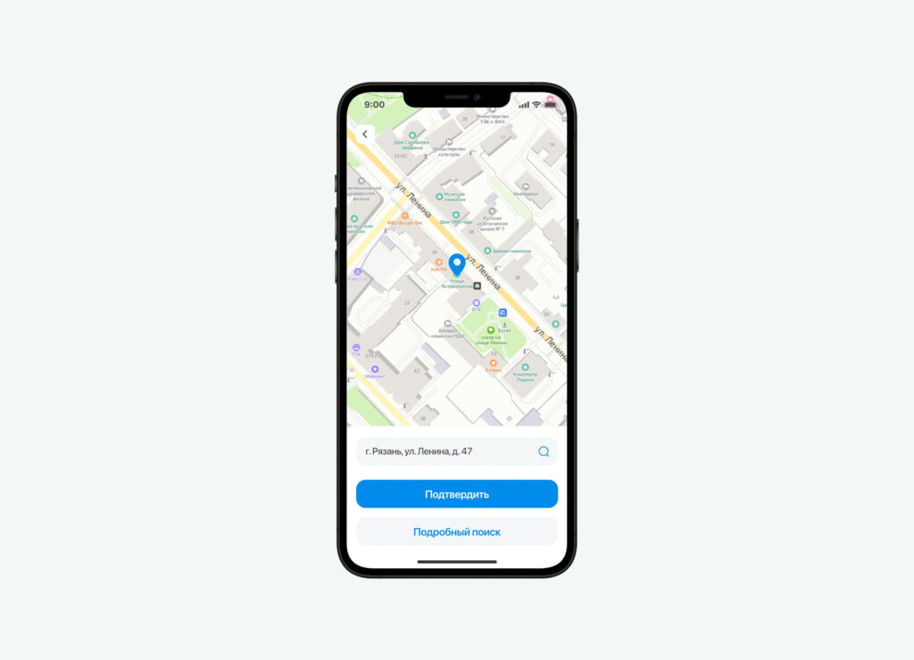 Вне зависимости от выбранного типа пользователь попадет на экран результата поиска. Если данных было достаточно, то будет отображен единственный адрес. Пользователю остается только подтвердить выбор нажатием на кнопку «Подтвердить выбор».
