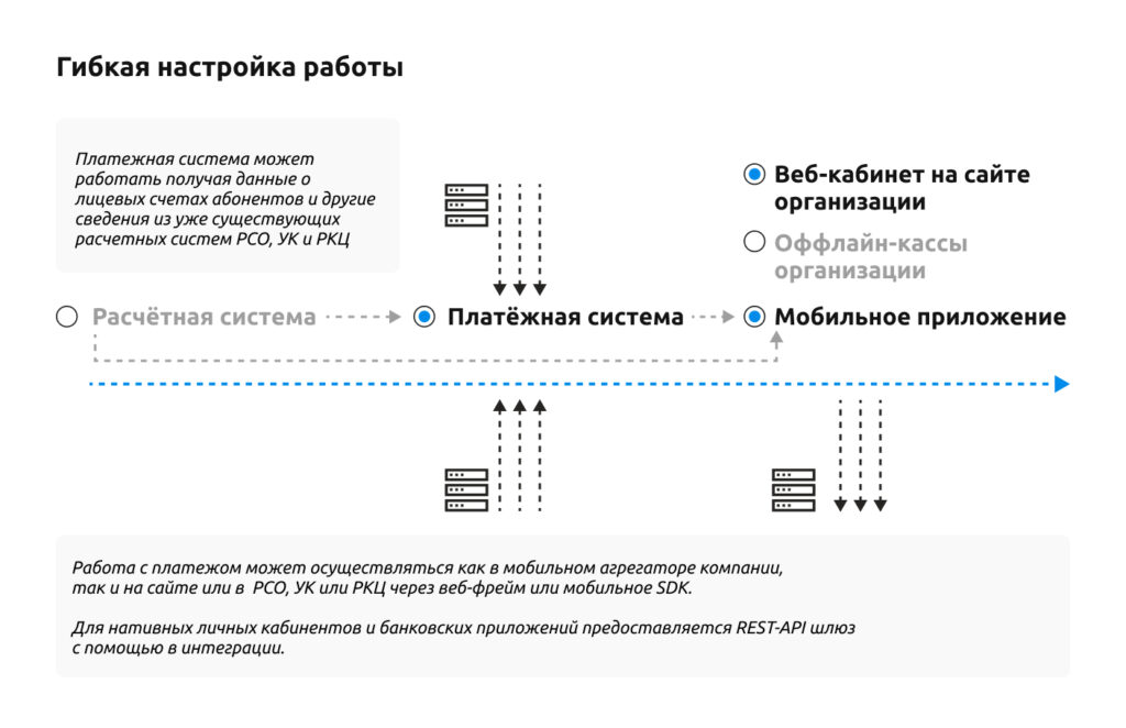 Средства принимаются через любой удобный канал: в кассах пунктов приема платежей, через личный кабинет, мобильное приложение или веб-фрейм, приложения и офисы банков, а также почтовые отделения. Информация о принятом платеже поступает в платежную систему, а средства распределяются через эквайринг банка-партнера по поставщикам ЖКУ.