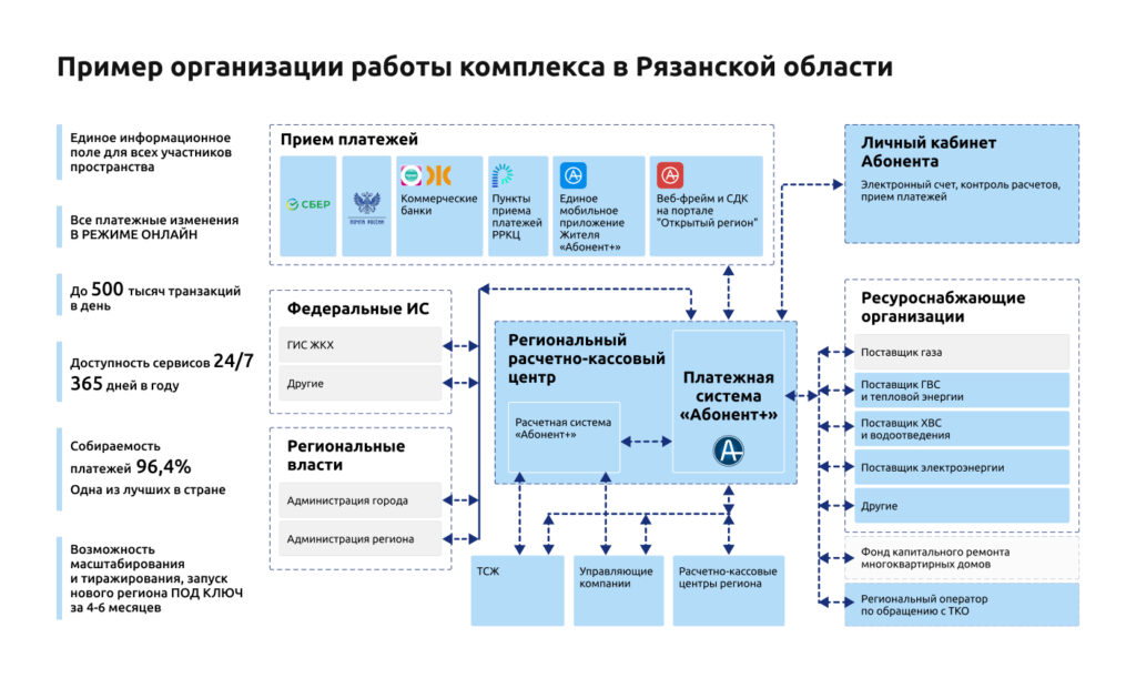 На схеме выше можно ознакомиться с примером реализации единой цифровой экосистемы по приему платежей в Рязанской области.